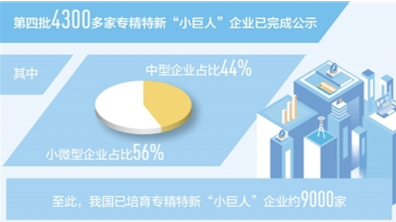 从工业和信息化部日前举行的“新时代工业和信息化发展”系列新闻发布会上获悉:第四批4300多家专精特新“小巨人”企业已完成公示,在完成认定程序后将正式发布。至此,我国已培育专精特新“小巨人”企业约9000家。